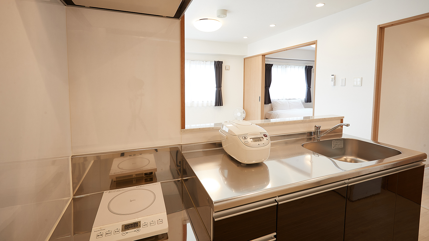 電子レンジ、炊飯器、調理器具、食器類のご用意もございますので、長期滞在にも最適です。
